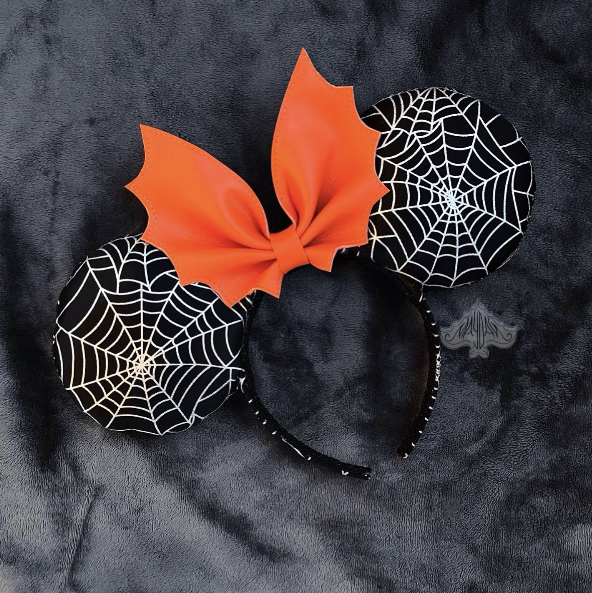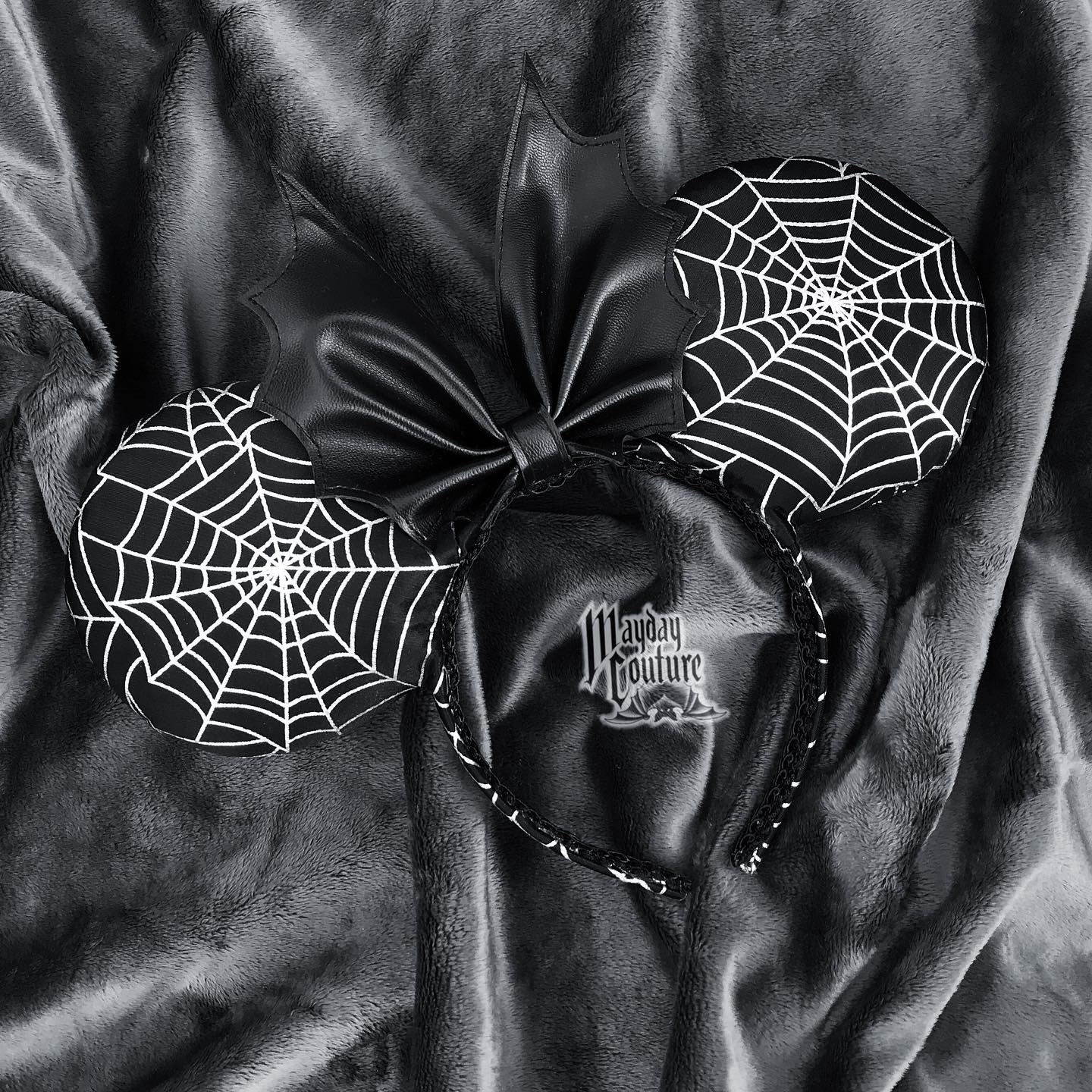 Handmade ears using with lycra spider web pattern fabric. Comes with a faux vinyl bat bow.