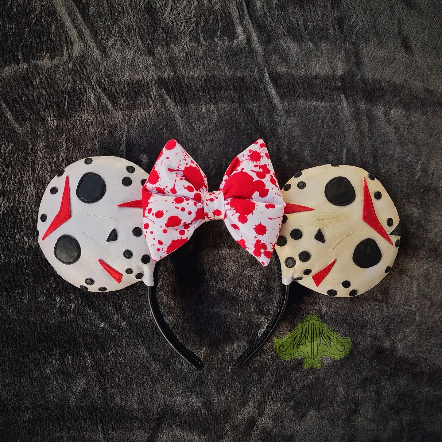 Handmade inspired by Jason Vorhees from Friday the 13th. Handmade with white, black and red faux vinyl fabric. The center of the headband comes with a blood splatter pattern bow